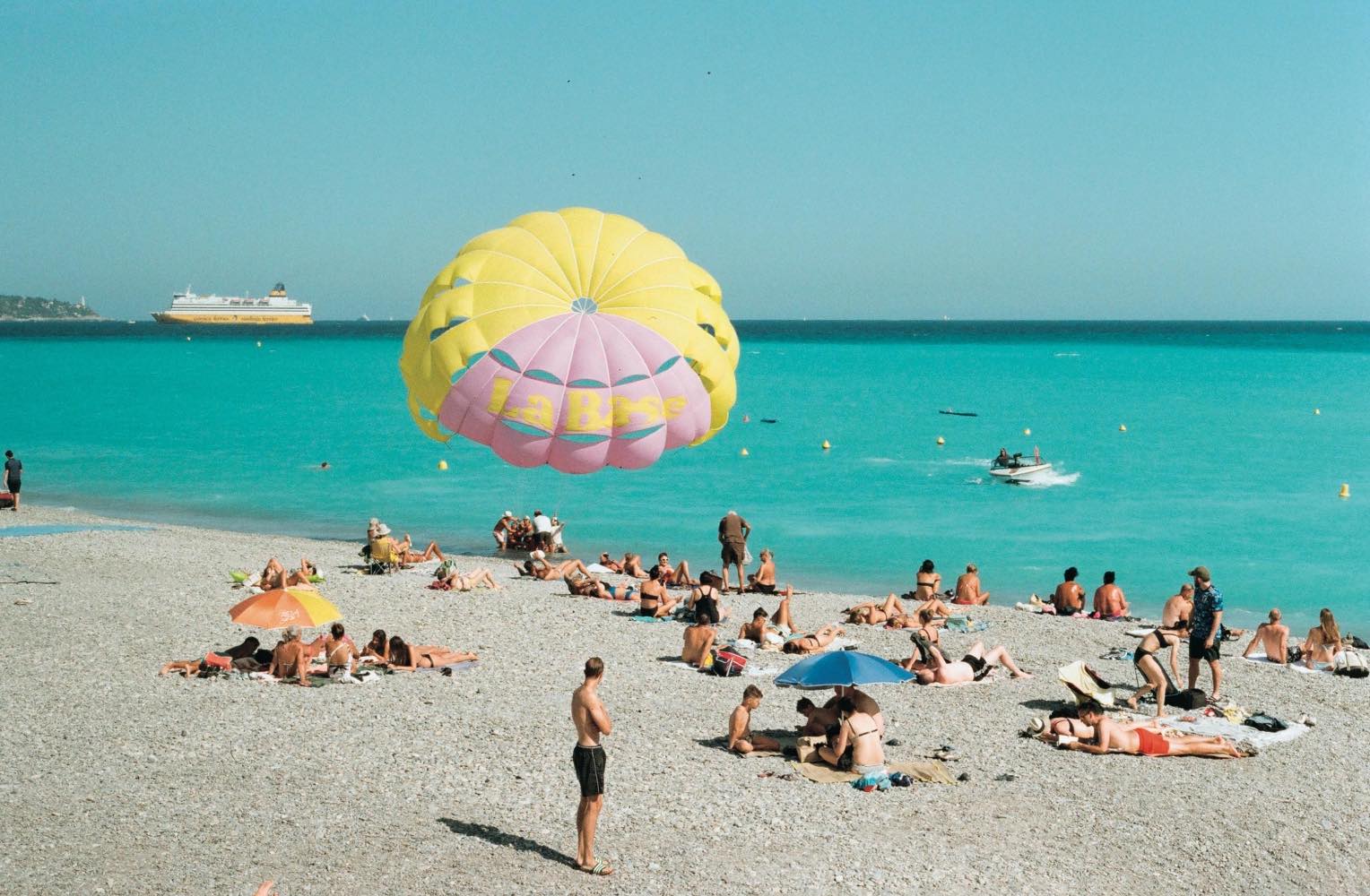 小道を抜けると街はやがて長い小石のビーチへと姿を変え、気づけば私は「プロムナード・デ・ザングレ」と呼ばれる、ニースを象徴する海沿いの大通りを歩いていた。通りにはヤシの木が立ち並び、壮麗なホテルがいくつもつづく。ビーチが多すぎてどこに行けばいいのか迷う。ふと目に留まったのは、水着姿でバスケットを片手に持った、ジェーン・バーキンのような上品な女性だった。その後ろ姿につられて少し行くと辿り着いたのは、ターコイズブルーの海が広がるビーチ。小型のボートに引かれてパラセーリングを楽しむ人に砂のお城を作る子どもたち、そしてトップレスで日光浴をする、肌が驚くほど焼けた女性たち。まるで絵葉書のなかにいるみたい。