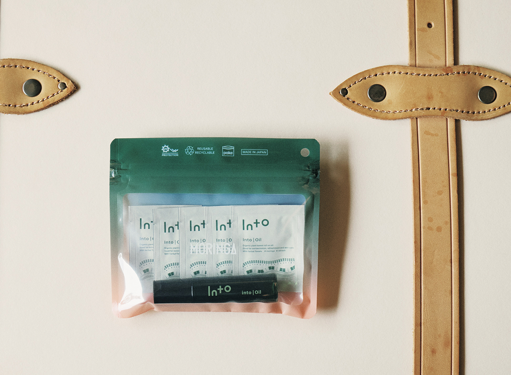 『TRANSIT』とコラボしたトラベルセット。手首や首に一塗りして香りを楽しめるロールオンタイプと、顔や髪など広範囲に使用しやすい使い切りのパウチタイプを、オリジナルPake (ジップバッグ) に詰め込みました。