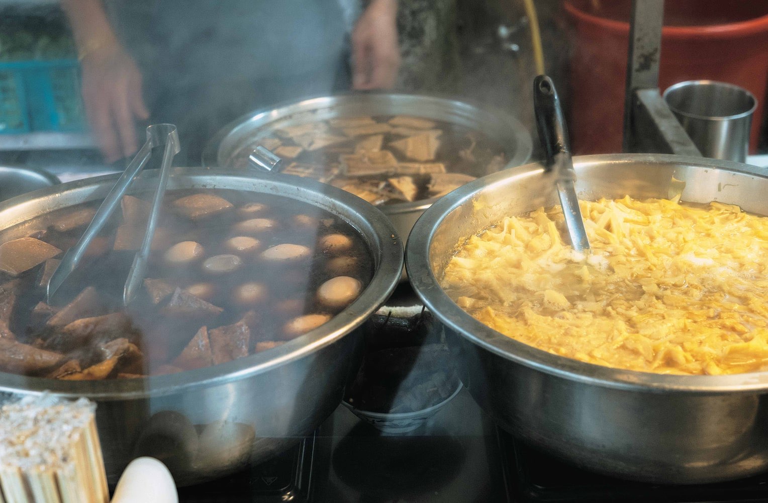 ローカルに親しまれている龍泉市場の裏口にある小吃店〈龍泉深海鮮魚湯〉。メニューが豊富で、店頭には肉、魚、卵、野菜のさまざまなお惣菜が並ぶ。「市場に隣接した屋台がおいしい」ことは、台湾人や台湾ツウのなかでは常識だ。「好きな台湾料理は魯肉飯。地元・嘉義では雞肉飯が有名だけれど、どこでも食べられるから!」