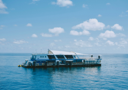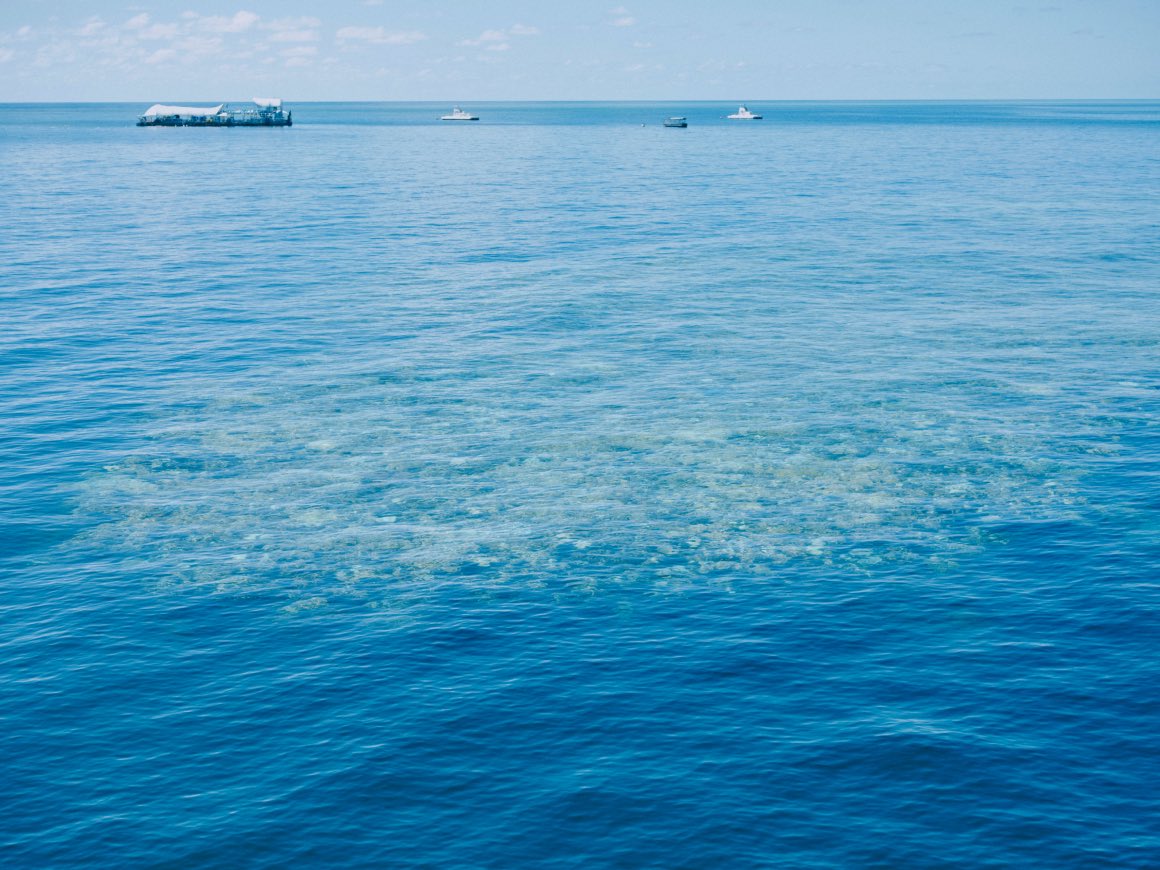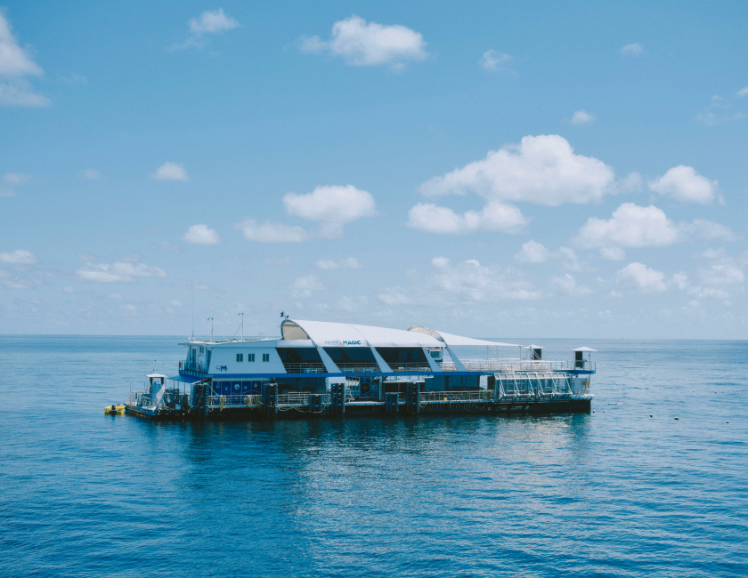 ケアンズ港を出航して1時間半ほどが経ち、海の真ん中に浮かぶポンツーンが見えてきた。船がポンツーンに接続され、いよいよ自由時間が始まった。ここではスキューバダイビングやシュノーケリングで海の中を見ることができるほか、海洋生物学者の博士とともにガラス底ボートに乗って海を回遊できる。