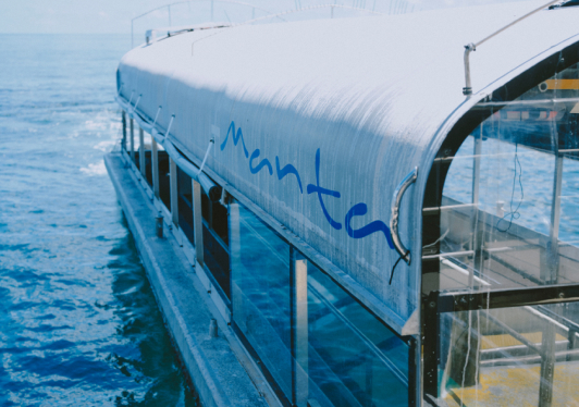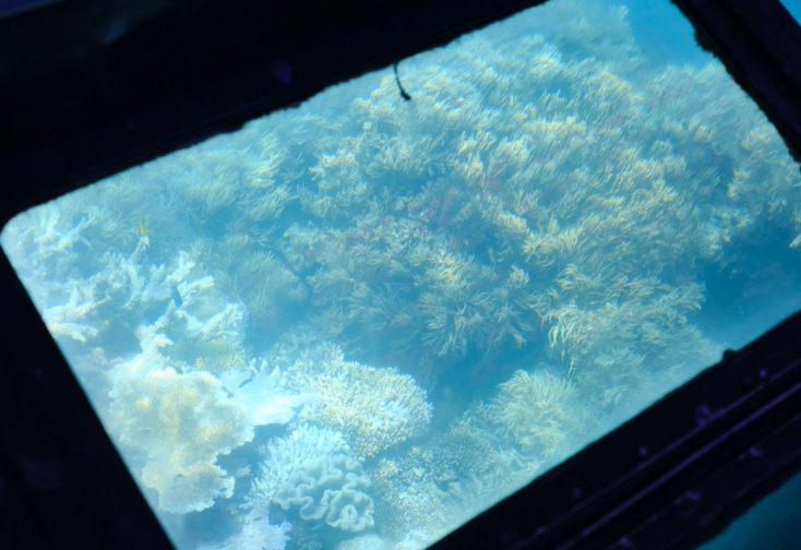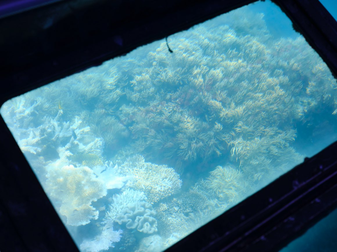 ガラス底ボートに乗りたいと思っていたところ、運よくリーフマジック・ポンツーンで20年にわたってサンゴ礁の保全に取り組んでいるエリック・フィッシャー博士とともに海を回れることとなった。ボートが動き出して少しすると、サンゴ礁の上でゆっくりと停まった。