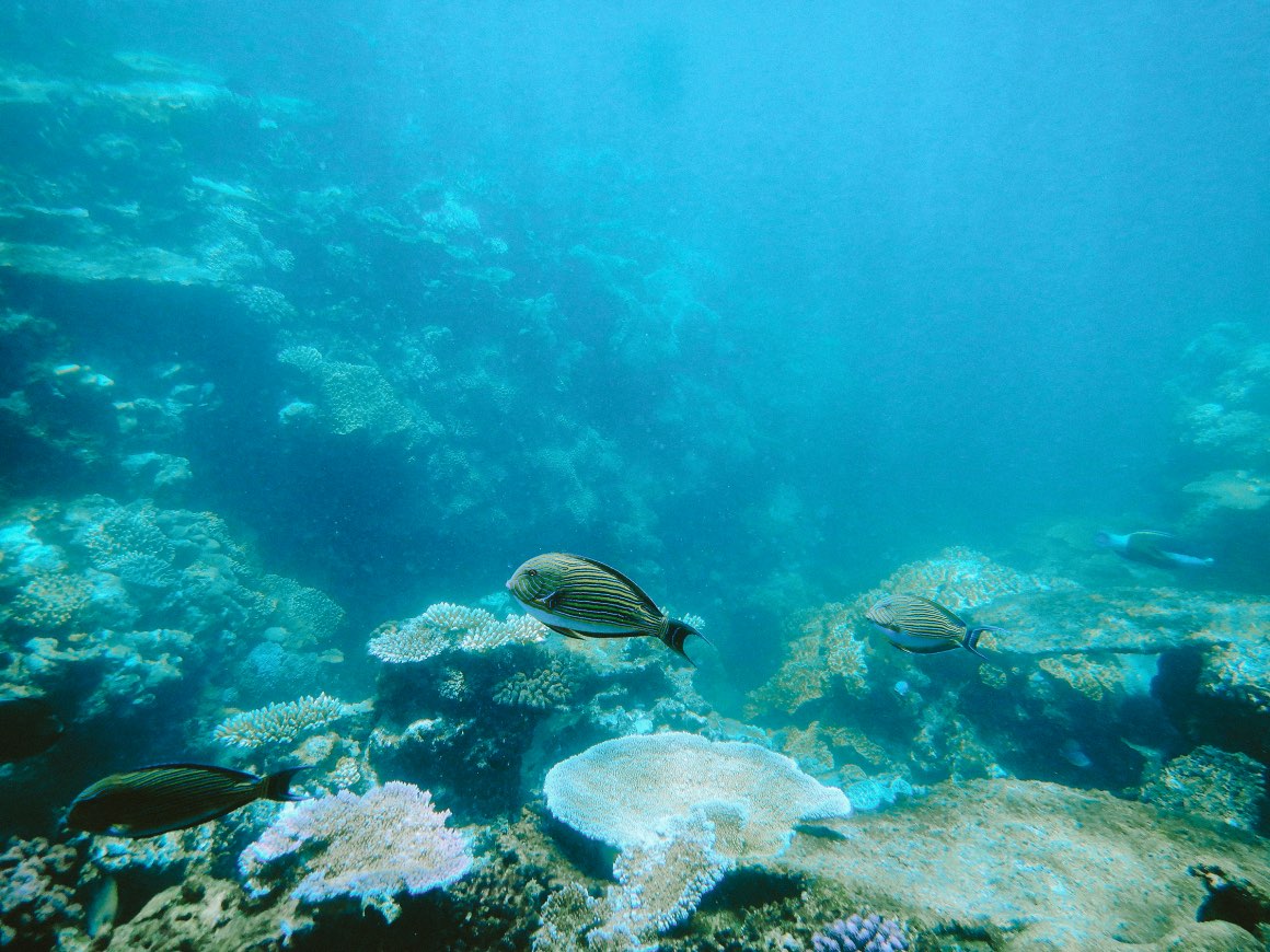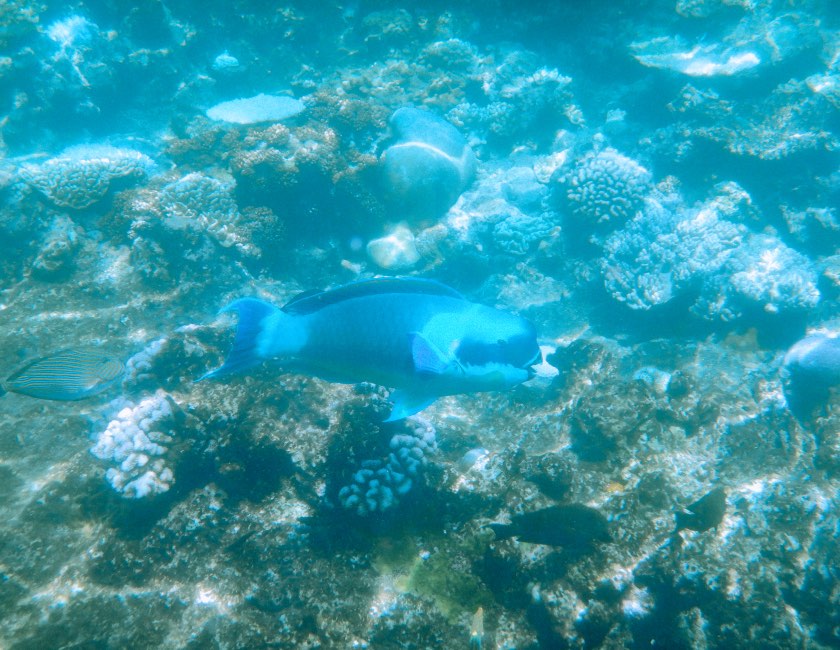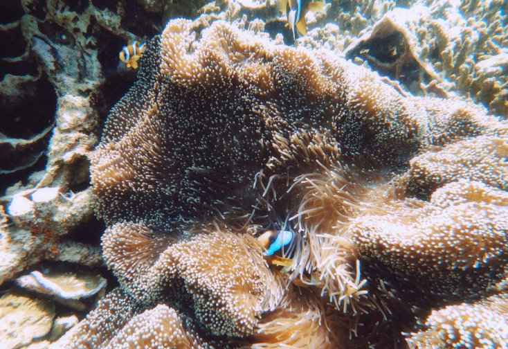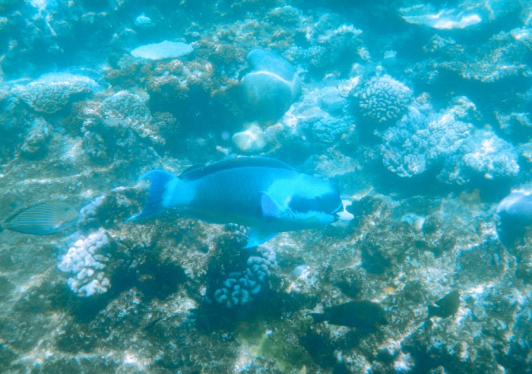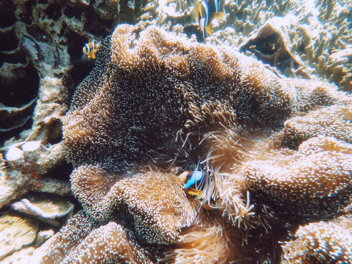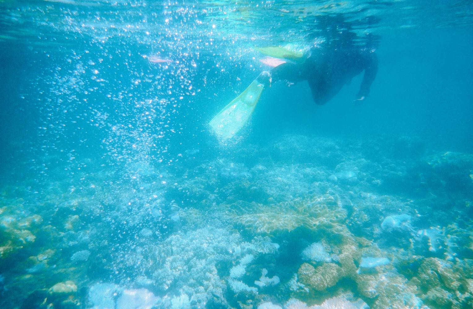 ナポレオンフィッシュやカクレクマノミ、青や黄色のカラフルな魚の群れ、先ほどガラス底ボートで見たような色鮮やかなサンゴ礁が絨毯のように広がっている。ガラス越しではなく海の中で直接見ると、より鮮やかなのが分かる。先ほどフィッシャー博士が、しばらく雨が続いた影響で海水が緑色に濁っていると言っていたけれど、ふだんはこれ以上に鮮明に透き通っているのかと思うと驚きだ。
