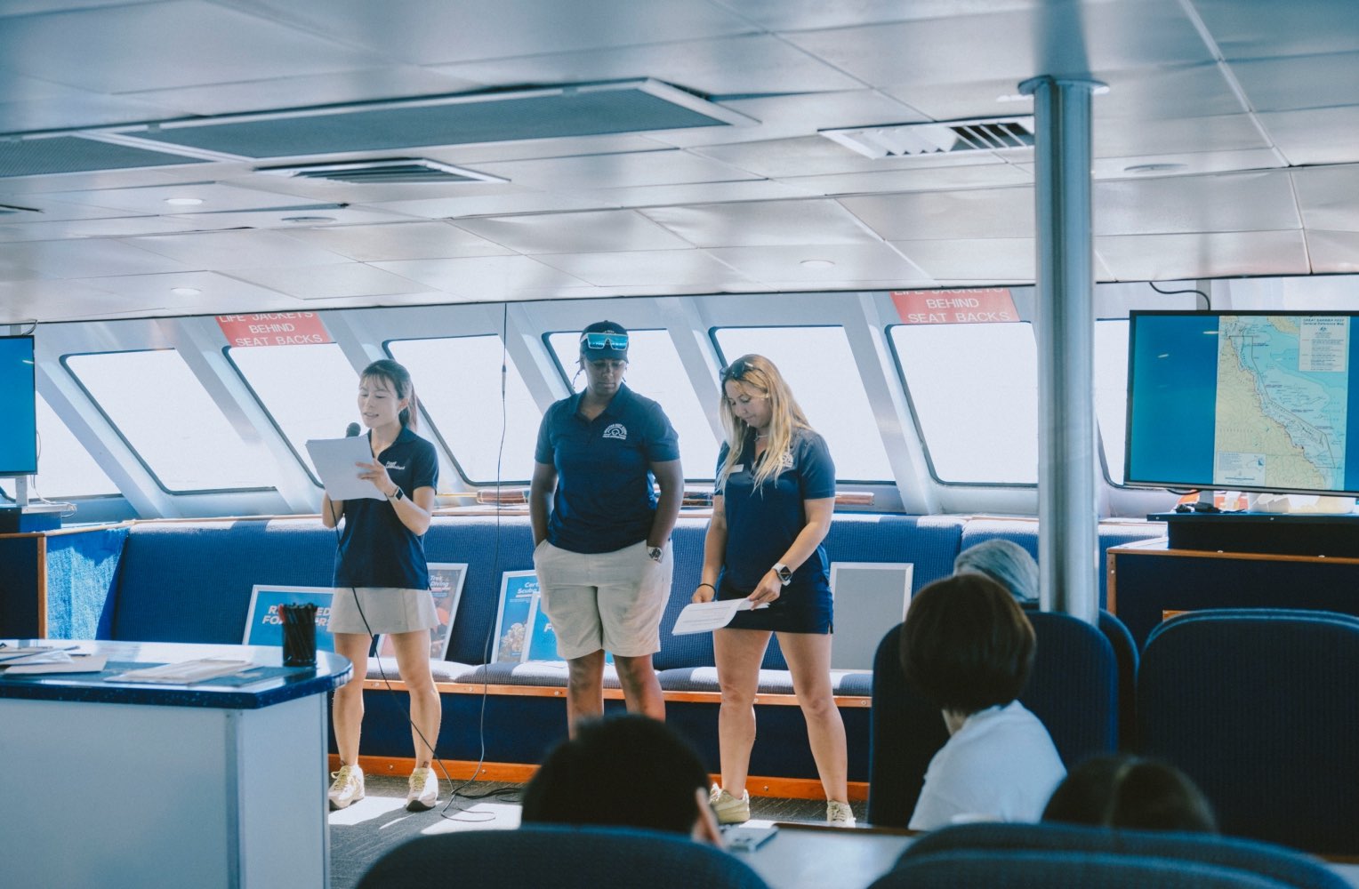 船に乗って少しすると、客室の前方でグレートバリアリーフの基礎情報やサンゴの白化現象についてのレクチャーが始まった。スライドショーでわかりやすく教えてくれるので、レジャー目的でこの船に乗っている乗客も、海の中で起きていることに自然と意識を向けることができる。